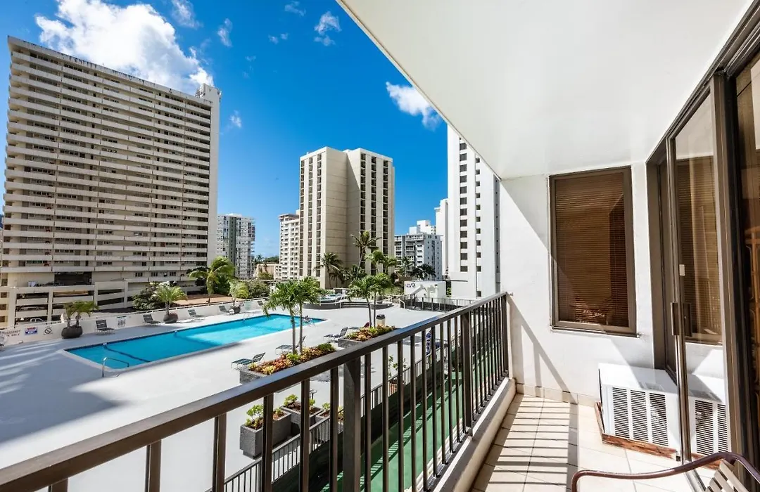 7Th Floor Pool View Condo - One Block From World Famous Waikiki Beach Apts offers a patio and a balcony furnished with a writing desk, as well as comforts like an iron and ironing board, and an air conditioner. The property is equipped with a multi-channel television and wireless internet, perfect for guests to enjoy their free time. A bathroom features a separate toilet, a bath, and a shower, while a dryer and towels are also provided.